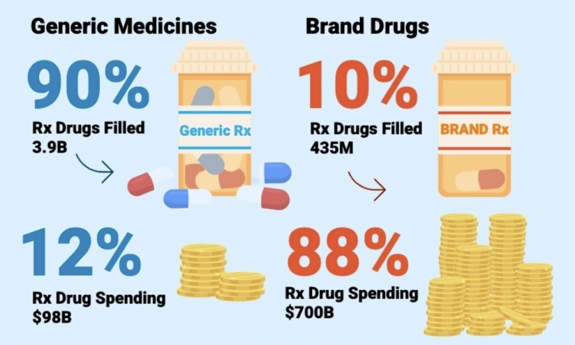 Generics comprised 90% of all prescriptions filled, but only 12% of prescription spending. Brand drugs made up only 10% of prescriptions filled but added up to 88% of the total drug spend.