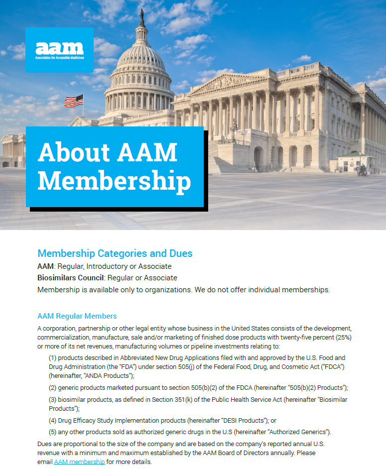 Join AAM, your industry association for generic and biosimilar medicines! No matter where you are in the product life cycle, AAM has a corporate membership option for you – and our team is ready to assist in choosing the most appropriate level of membership.