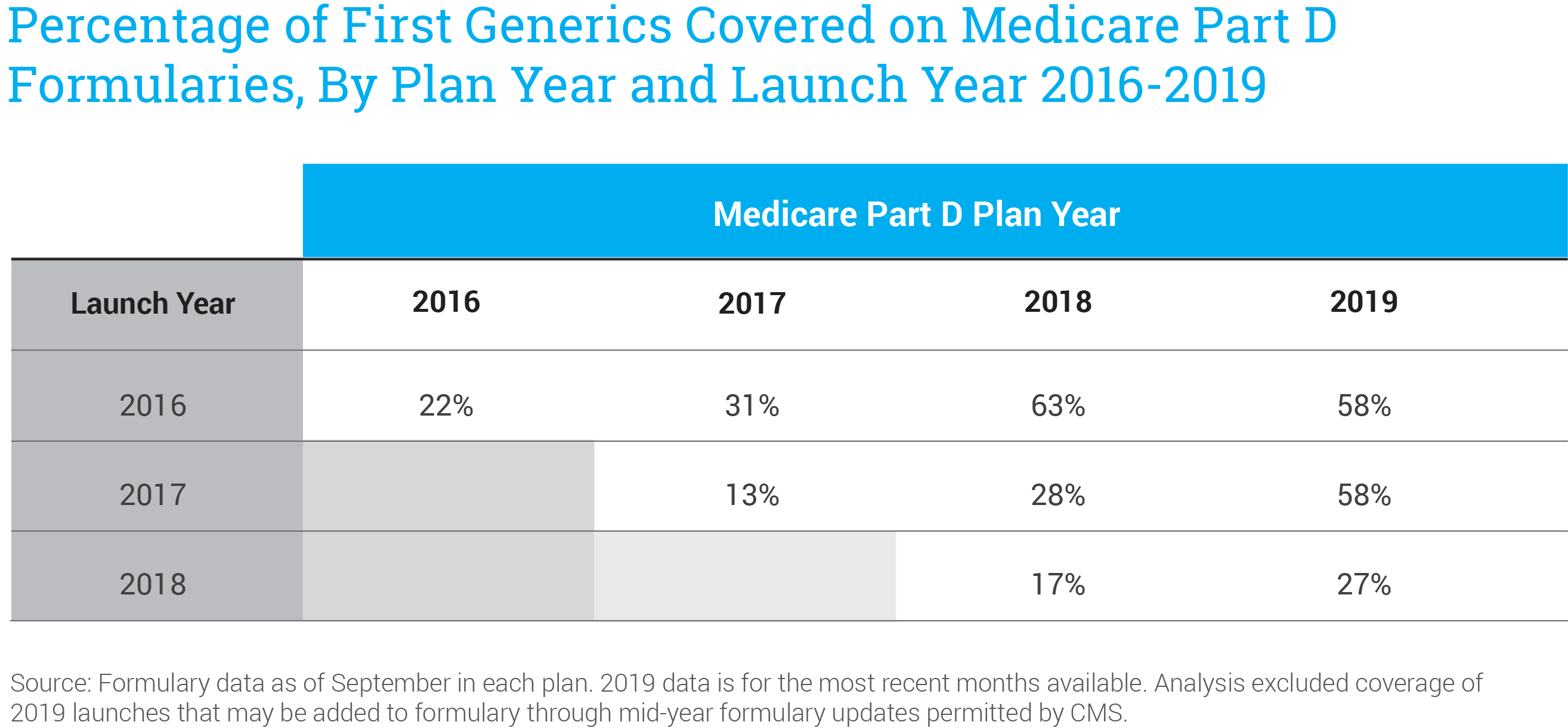 Moreover, of those that are commercially available, AAM found that only about half were included on formularies of Medicare Part D plans. Once they are added to formularies, first generics are routinely placed on expensive brand drug tiers with higher patient copays, rather than on generic tiers with lower cost-sharing. As a result, seniors do not benefit from lower prices and lower out-of-pocket costs, and taxpayers continue to pay for high-priced brand drugs.